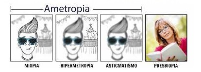 Ametropia: alt refrativa (axiais(eixo):Miop+Hmetro | de curvatura:Astigma | índice (de refração do meio):Catarata